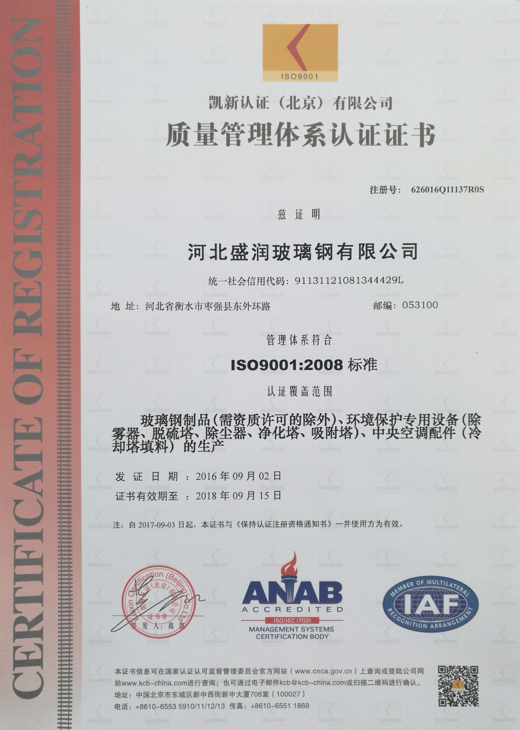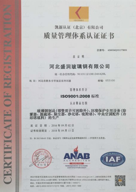 河北盛潤玻璃鋼公司通過ISO9001認(rèn)證